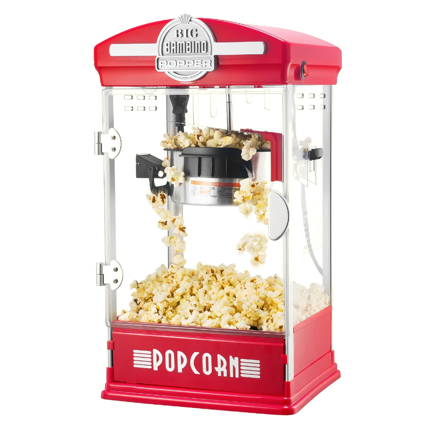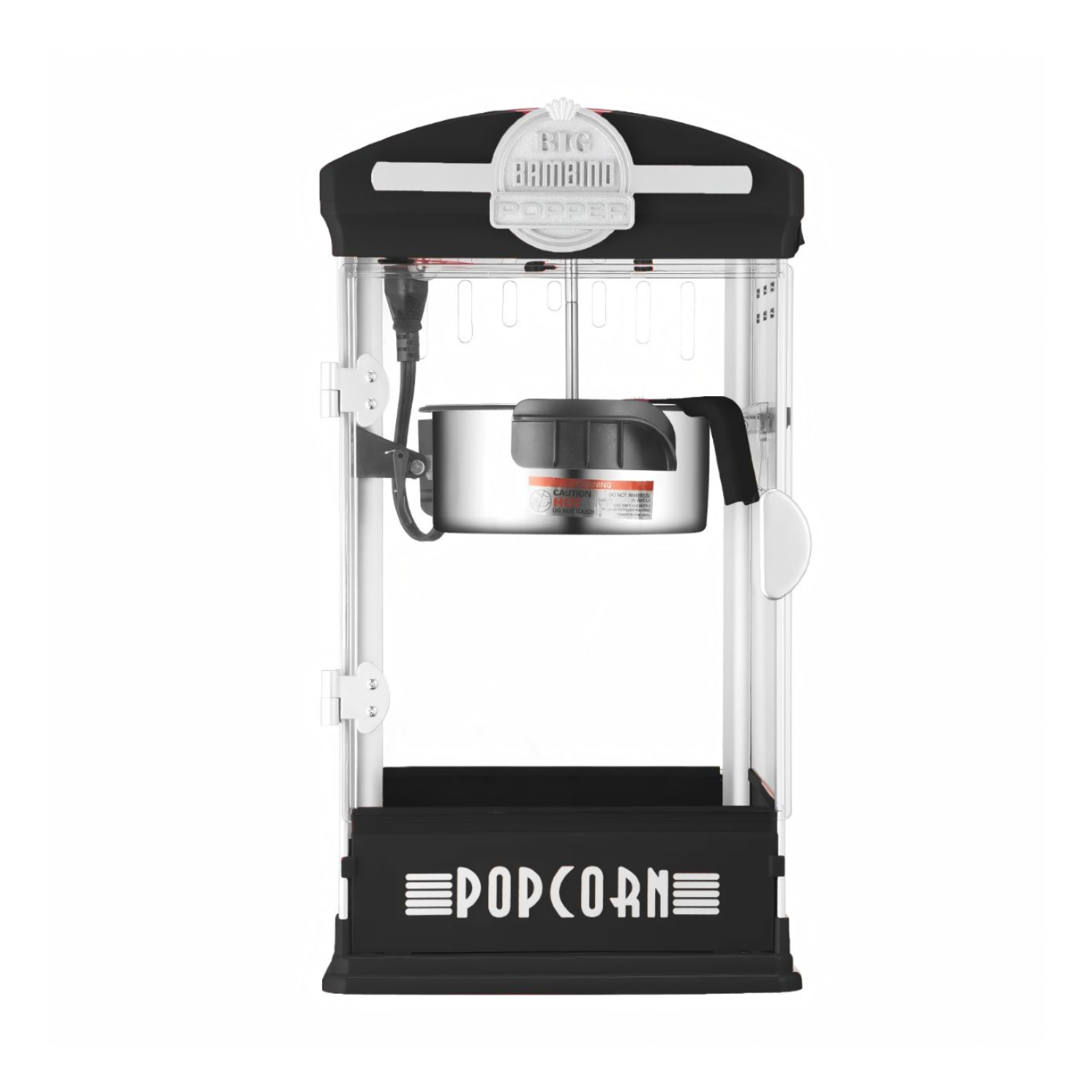 Pop and serve Cinema-style popcorn in your home or office with the Big Bambino Popcorn Machine. The perfect addition to your kitchen appliances and home movie theater decor, this vintage-look popcorn maker includes a 4-ounce stainless steel kettle that makes about 1.5 gallons of popcorn in minutes, a drop-down tray under the door for easy access to popped kernels, and a one-switch design that simplifies operation. The fun retro design captures the look of a concession stand or popcorn cart in a compact popcorn popper that fits seamlessly with your kitchen counter decor.