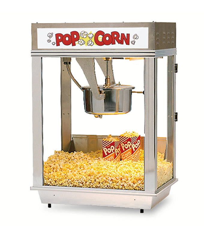 Fun and flexibilty never looked so good! This full sized favourite is the champion of the 12/14 oz. Poppers, featuring extremely heavy duty construction, aluminum frames and a high proformace stainless steel kettle. Will produce 210 1 oz servings per hour.